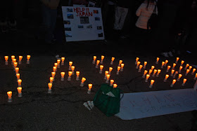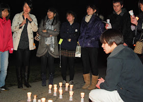 Below: Candles are lit at a candlelight prayer vigil at Michigan State University. The Japan Club hosted the event to raise awareness and support those affected by the recent natural disasters in Japan. The event was held near the rock, which unfortunately couldn't be painted before the vigil.
